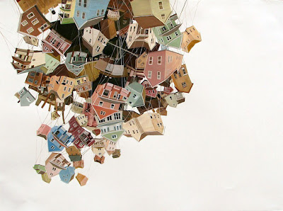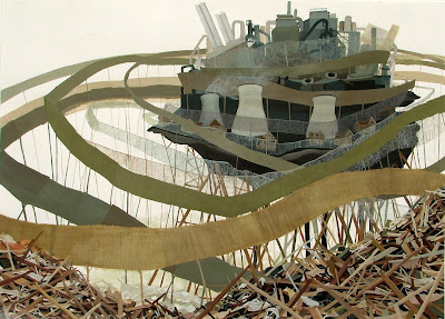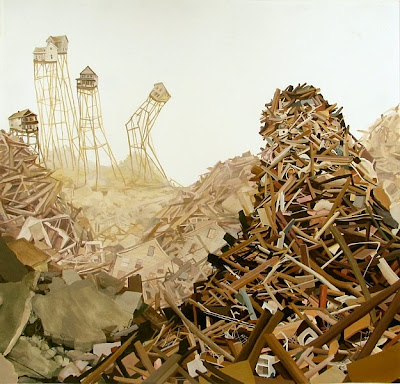 Reflecting the crumbling, nervous state of world affairs today, Amy Casey's paintings depict buildings and homes held together by haphazard strings and wooden braces cobbled from the wreckage strewn around them.